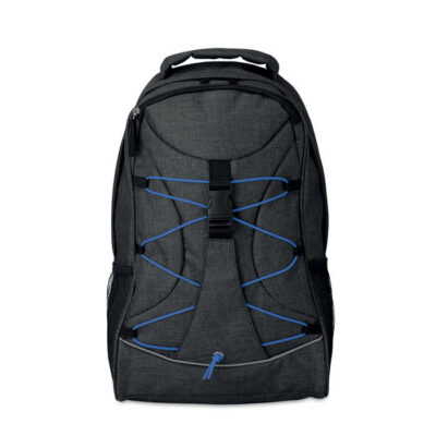 Backpack in 600D 2 tone polyester with colourful contrasting facing and glow in the dark cord on the front panel. Mesh pockets on both sides.