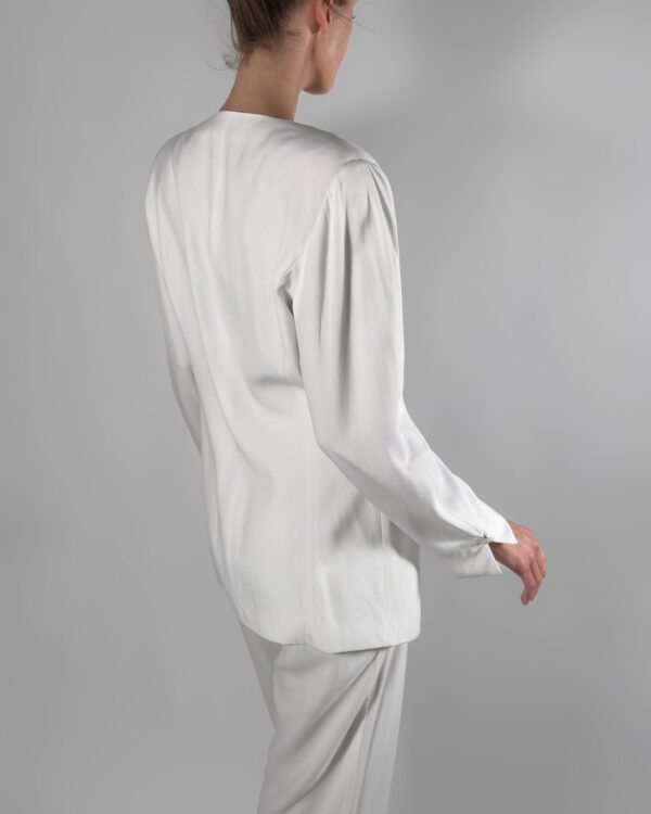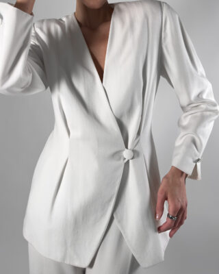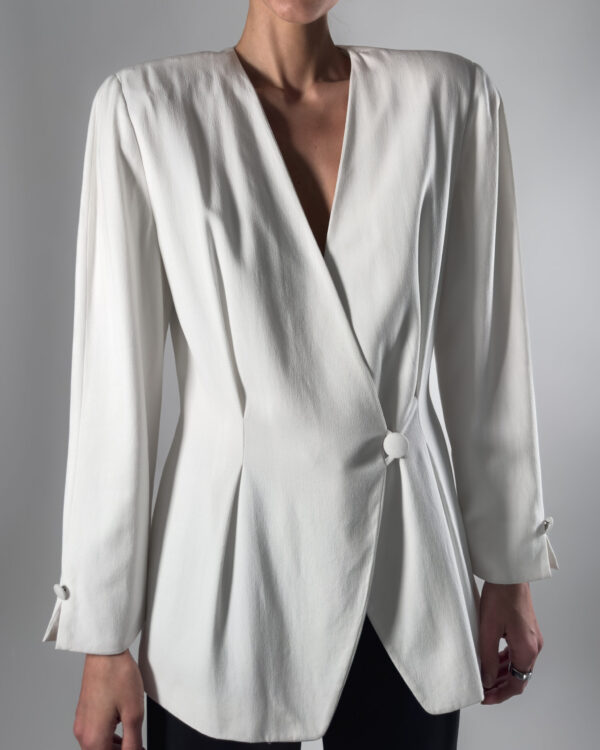 Viscose blend blazer in white. Designed with a sleek one-button closure, fully lined and features structured shoulder pads.