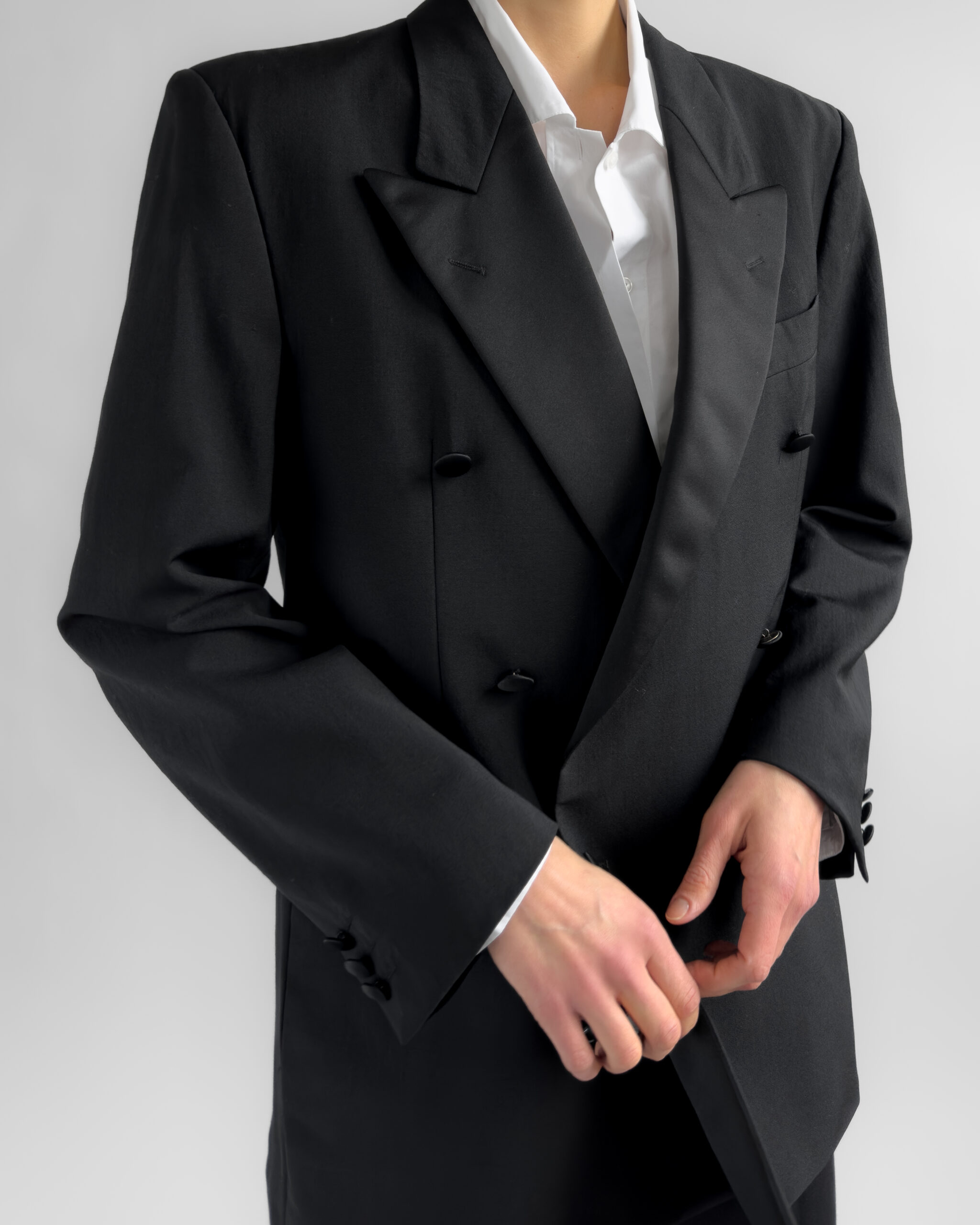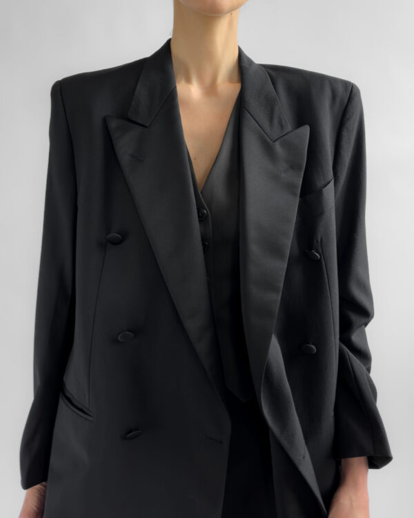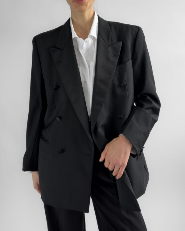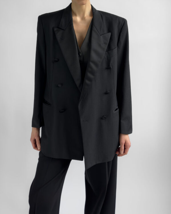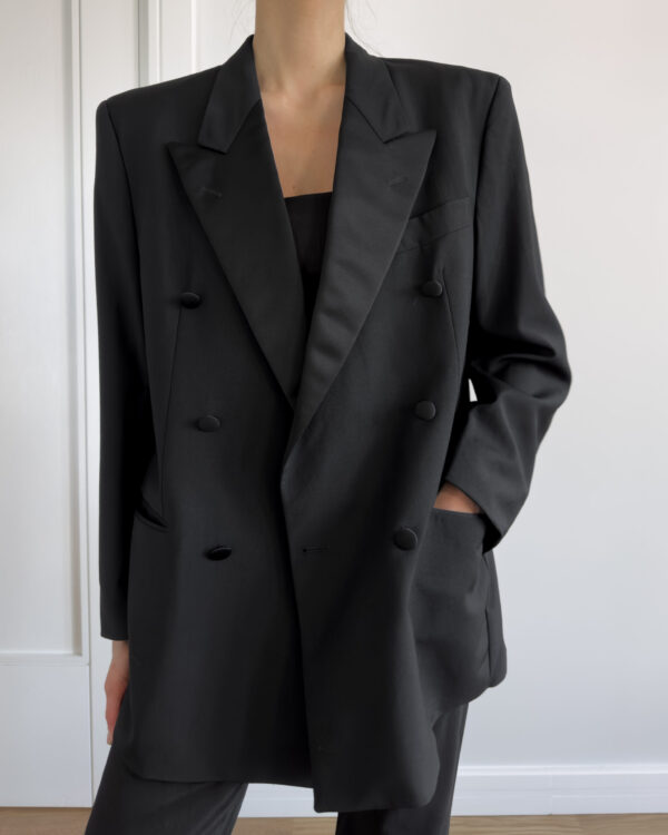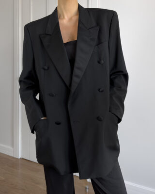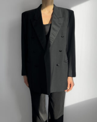 Tailored in a timeless double-breasted silhouette, this vintage blazer from Hugo Boss is made from 100% pure virgin wool. Featuring structured shoulders, black satin-covered buttons, and full viscose lining.