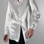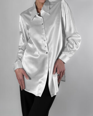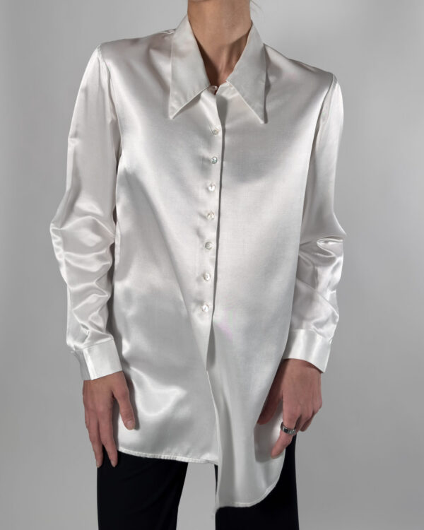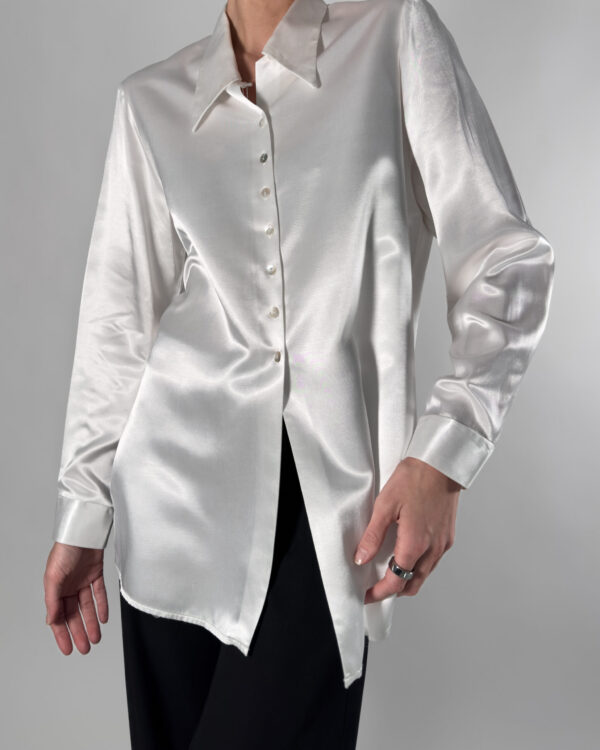 Long silky viscose blend blouse in white by Variations. Labelled as size 40.