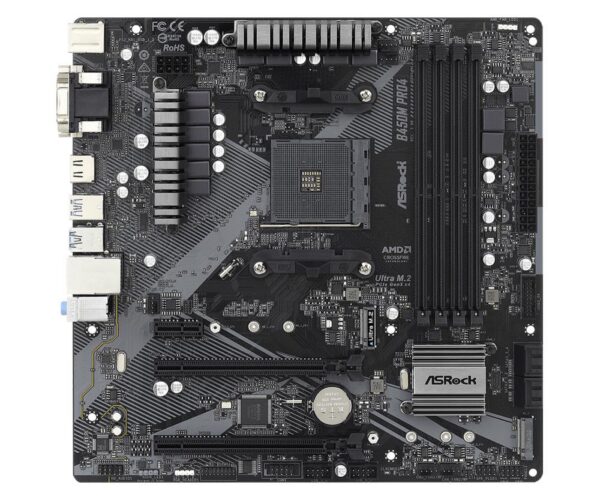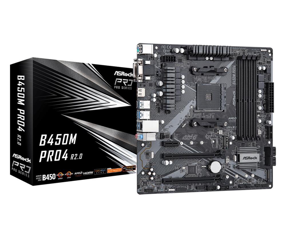 Mainboard|ASROCK|AMD B450|SAM4|Micro-ATX|Memory DDR4|Memory slots 4|1xPCI-Express 2.0 1x|1xPCI-Express 2.0 16x|1xPCI-Express 3.0 16x|2xM.2|1x15pin D-sub|1xDVI-D|1xHDMI|2xAudio-In|1xAudio-Out|2xUSB 2.0|5xUSB 3.2|1xUSB-C|1xPS/2|1xRJ45|B450MPRO4R2.0