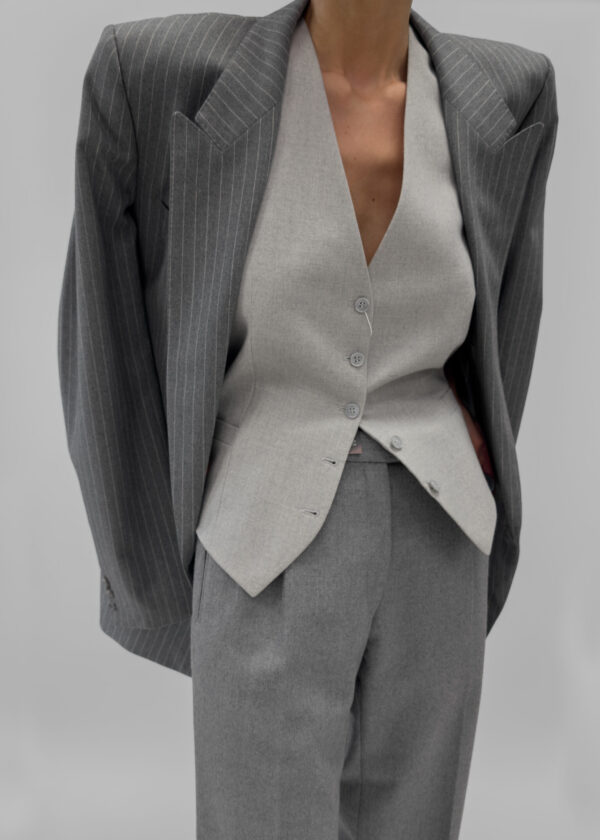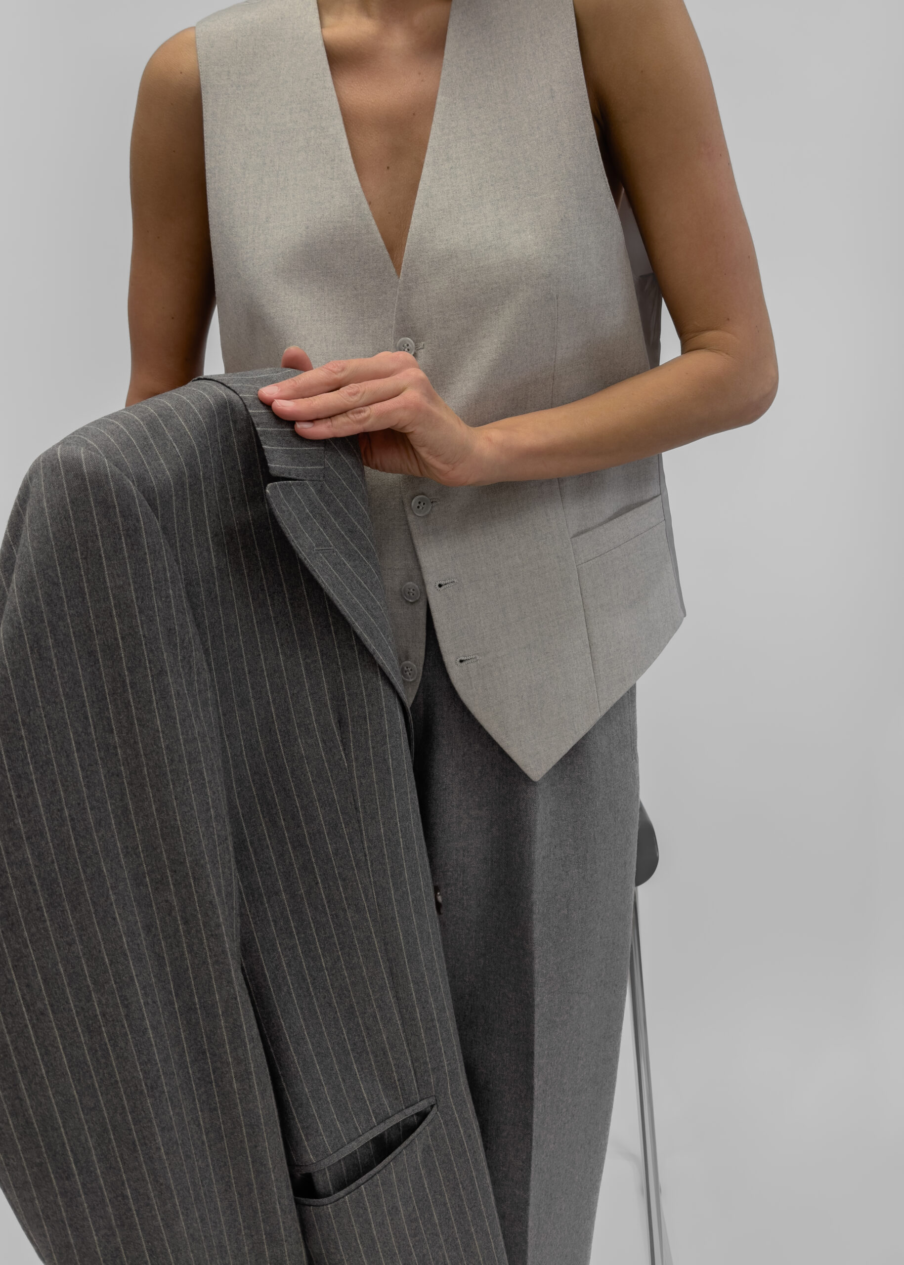 Cut into points, with deep V-neck, horizontal slit pockets and 5-button closure.