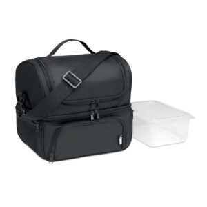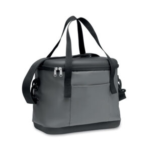 Recycled paper woven cooler bag for 6 cans. It has a handle and a front pocket. Isolation material: PE foam layer. Capacity 3L.