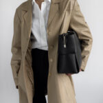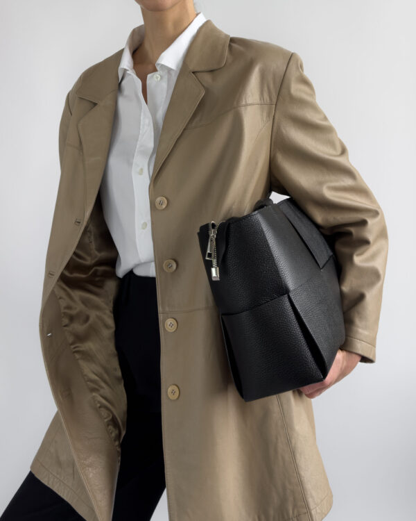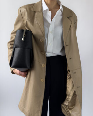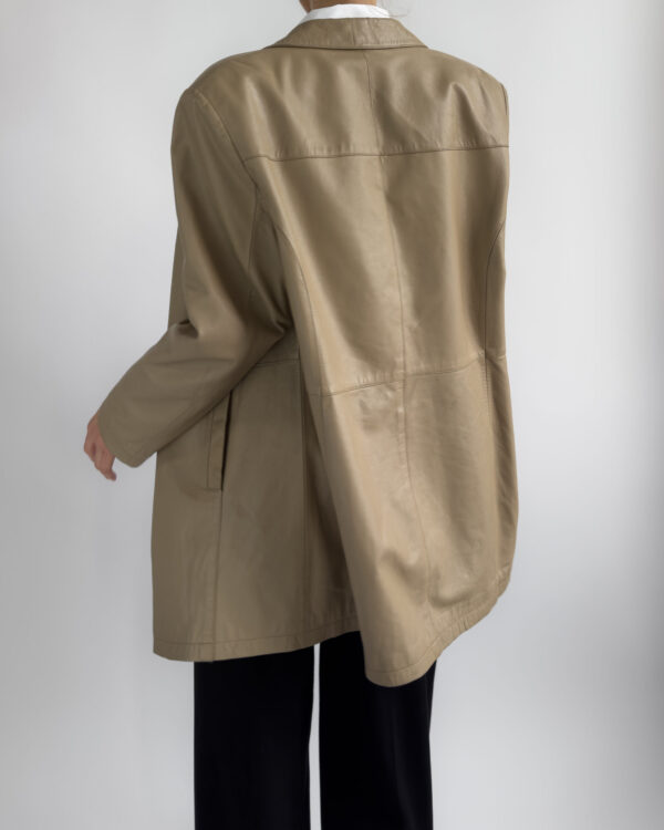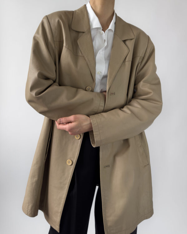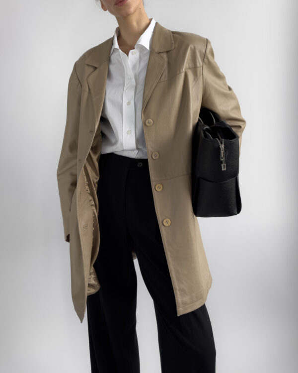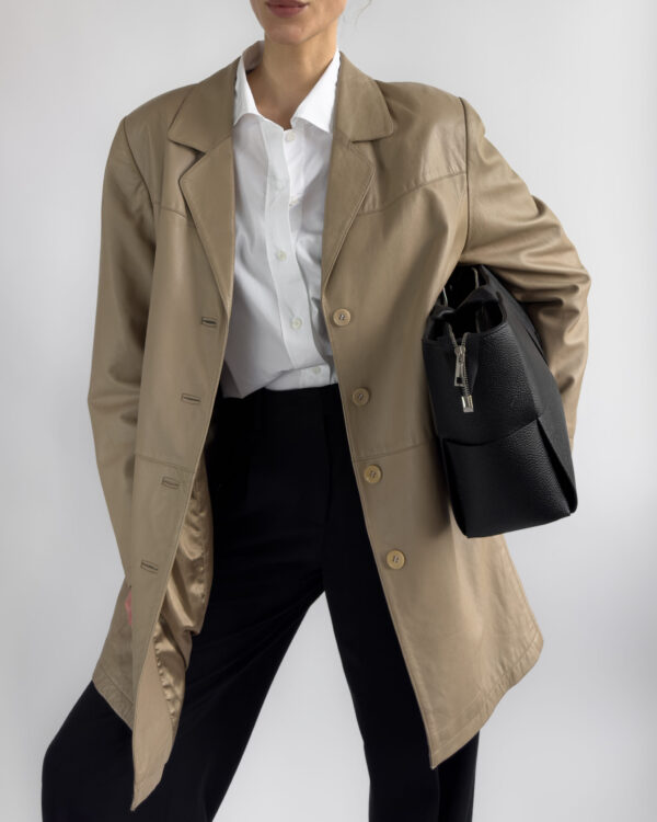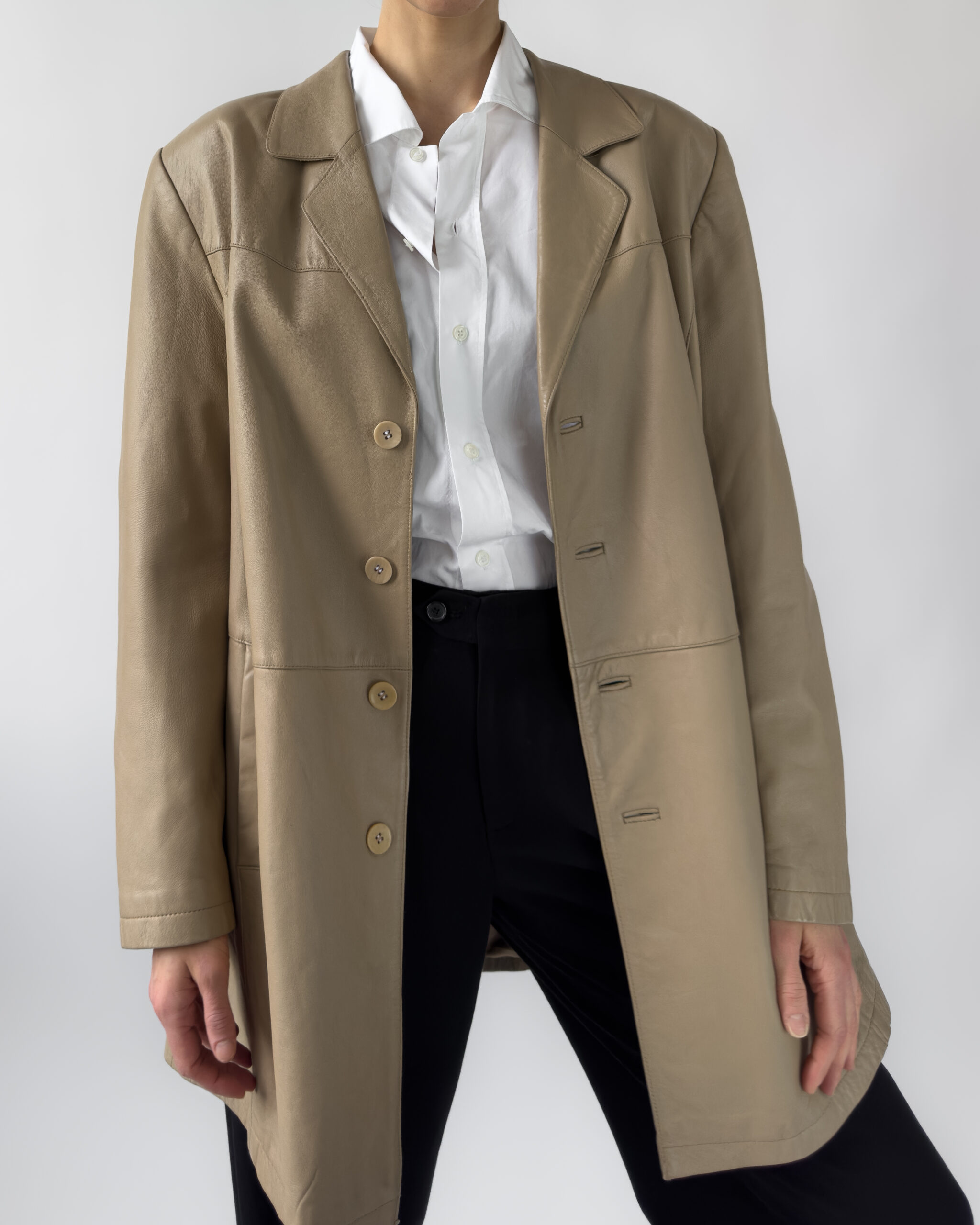 This genuine leather oversized coat in a soft taupe hue offers a relaxed, structured silhouette. Designed with a classic button-up front, two front pockets, and a luxurious gold satin lining.