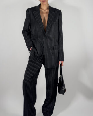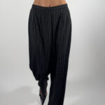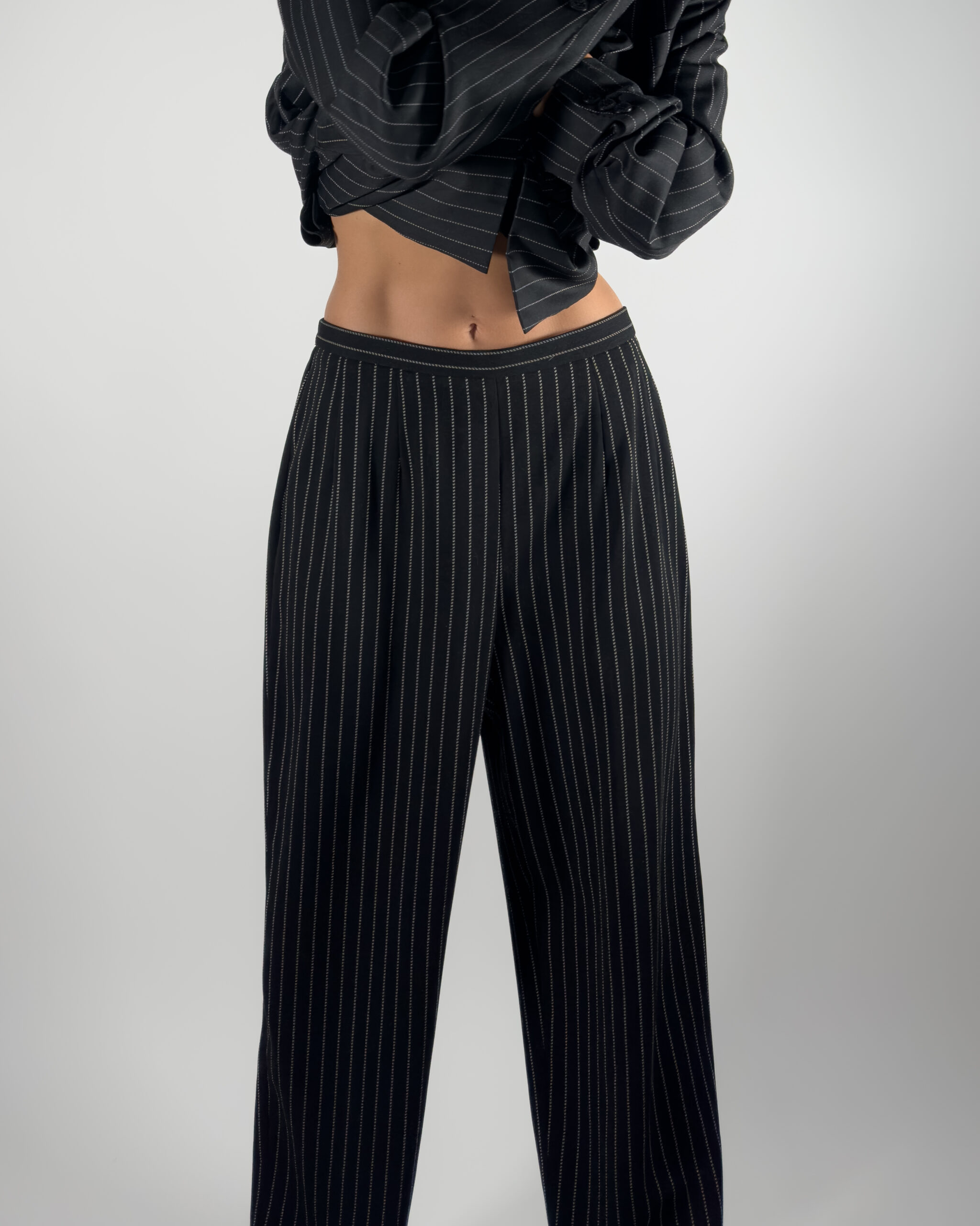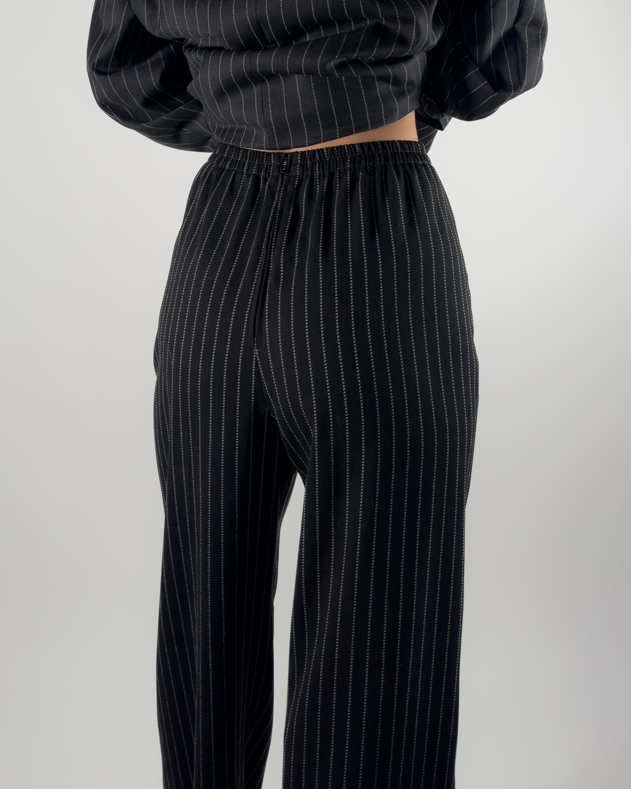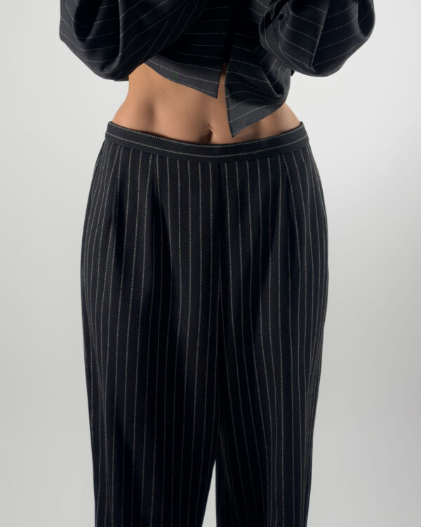 Elegant pinstriped trousers in black.