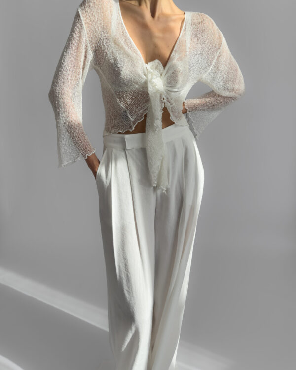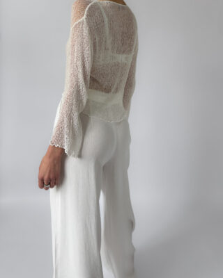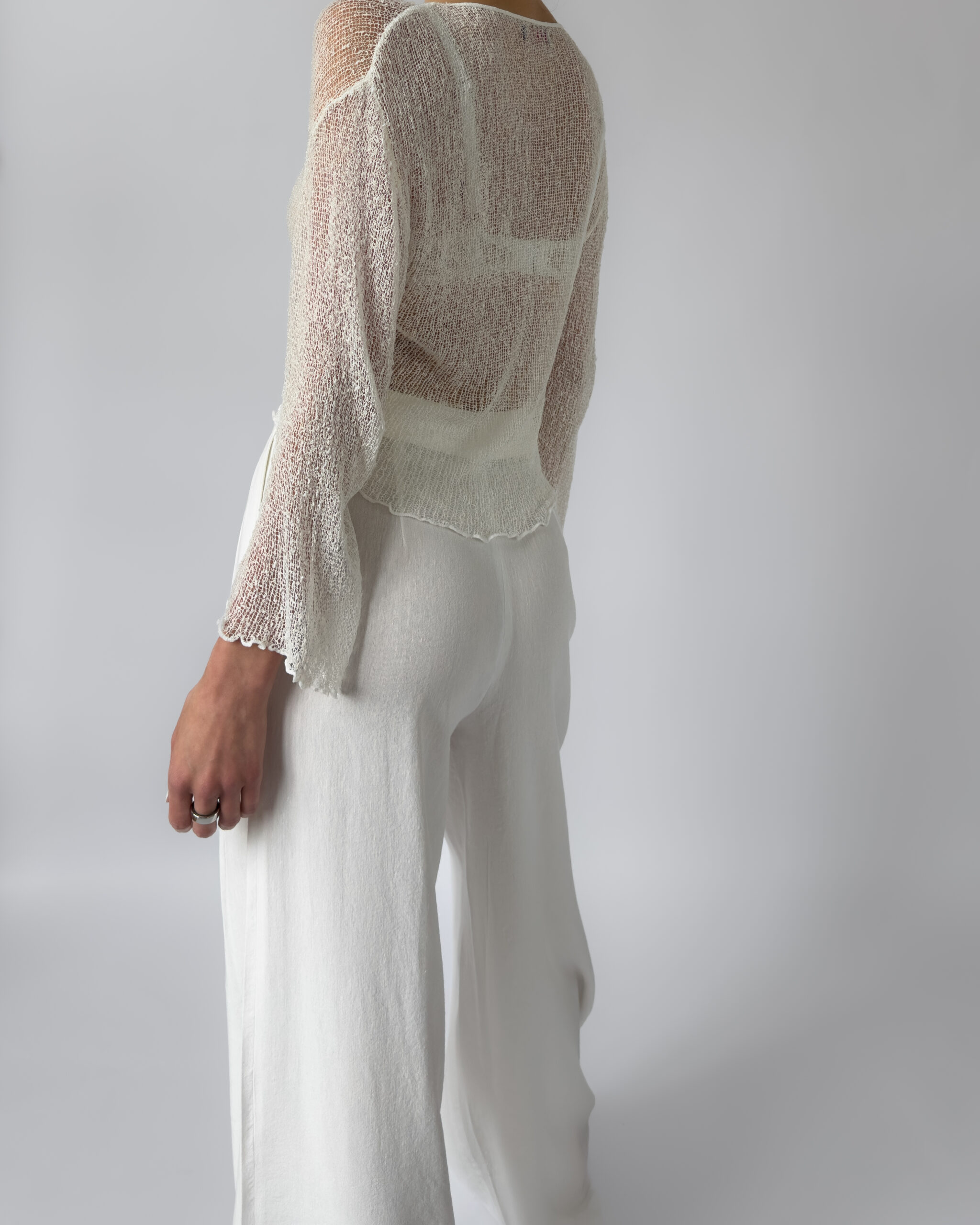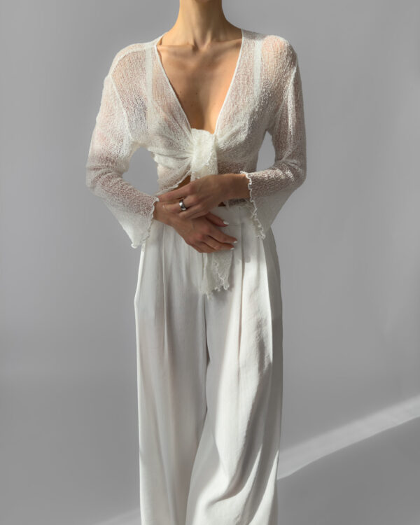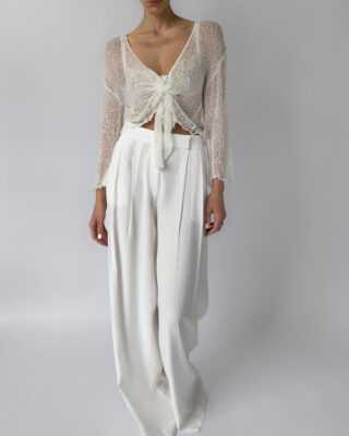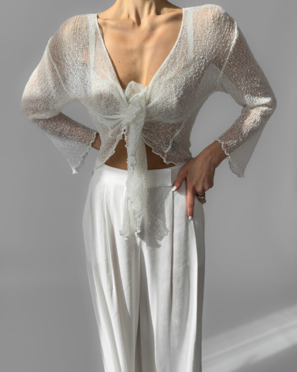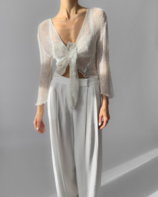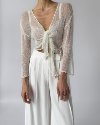 Delicate vintage summer top by Bali Rose, made in Indonesia. Made from a lightweight 70% acrylic and 30% polyamide blend, this semi-sheer piece features a soft tie-front closure and gentle flared sleeves with a subtle scalloped finish.