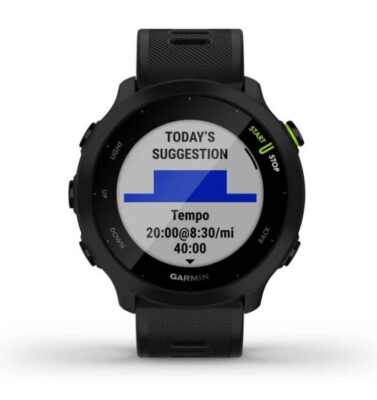 Forerunner 55 | Screen 1.04″ | Resolution 208 x 208 | Wireless connections Bluetooth | Material Silicone rubber | GPS | Material housing Glass | Colour Black | Dimensions 42 x 42 x 11.6 mm | Weight 0.037 kg