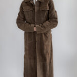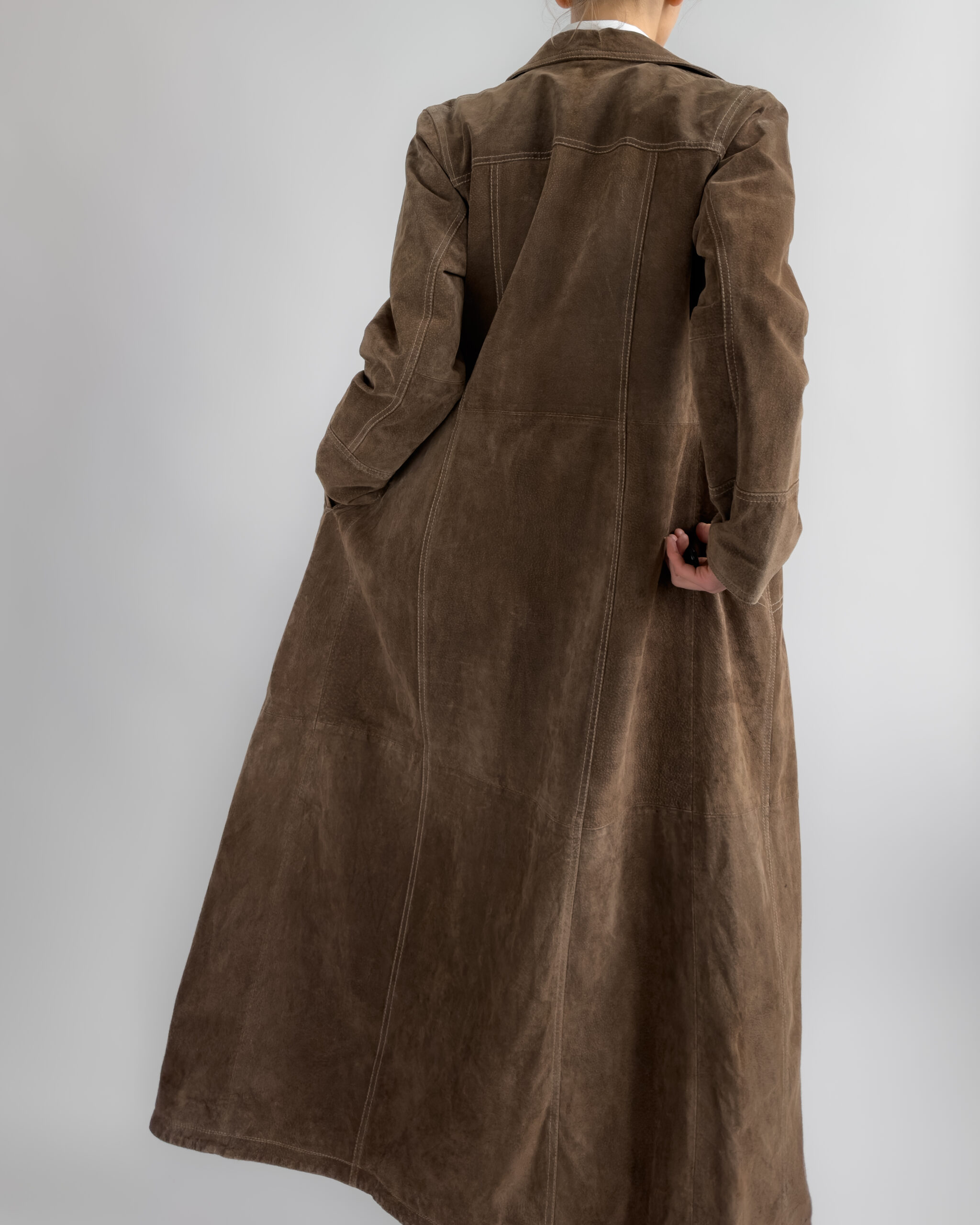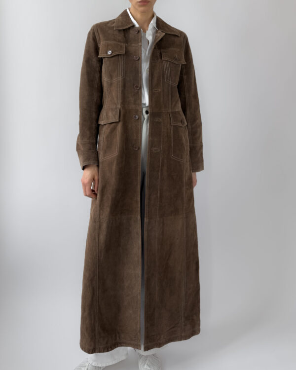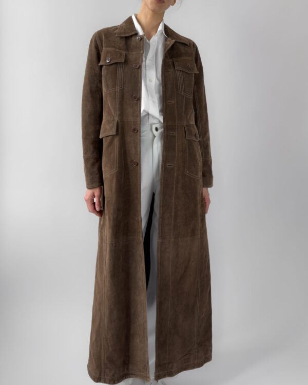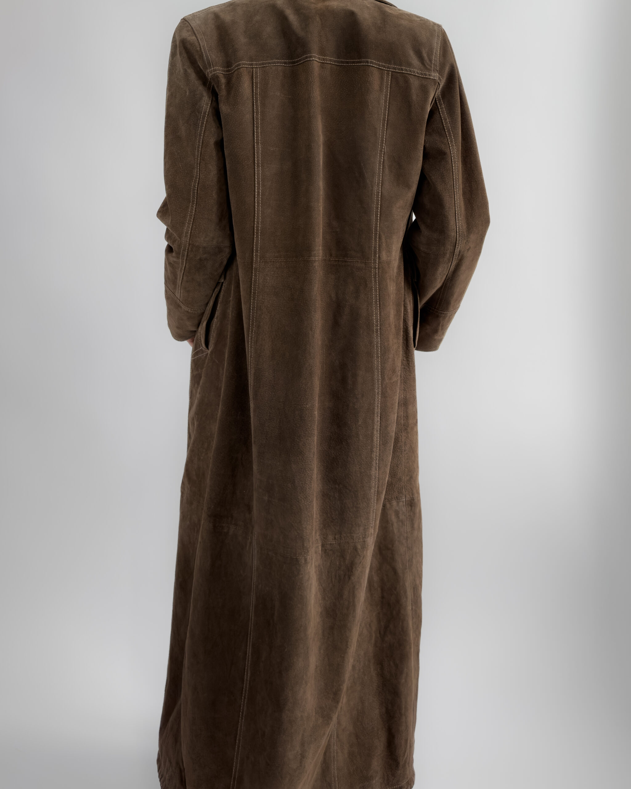 Longline suede coat with a structured silhouette. Made from soft genuine leather in a rich brown tone, it features a full button closure, front flap pockets, and tonal stitching throughout. The full-length cut adds understated drama.
