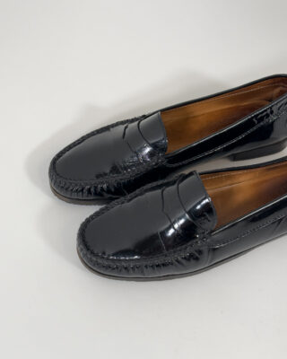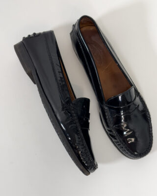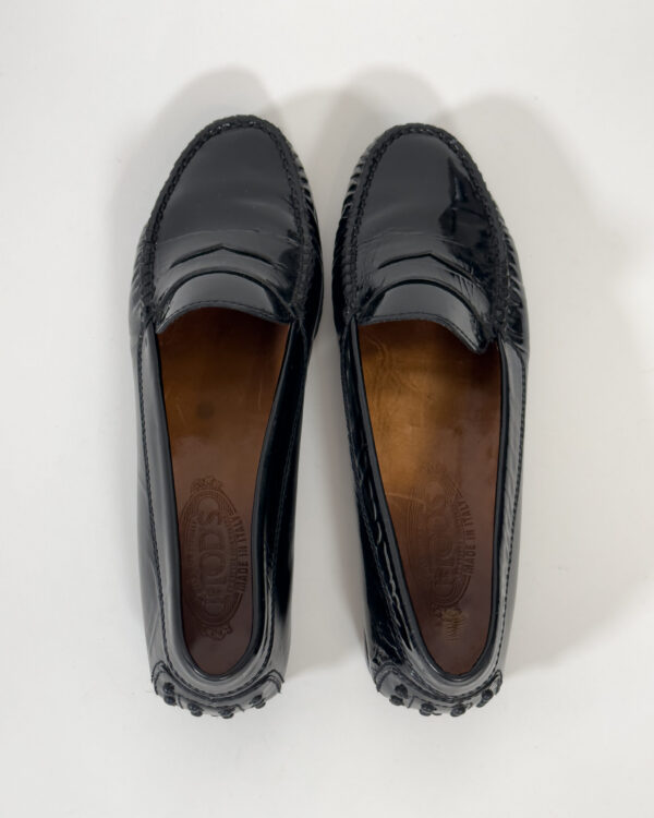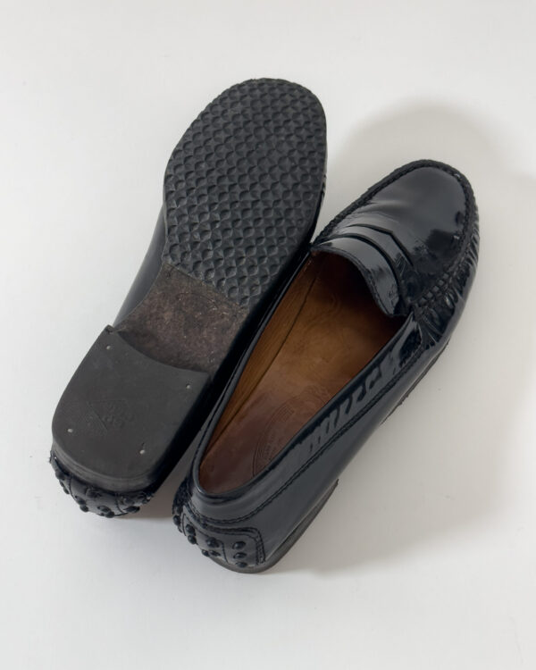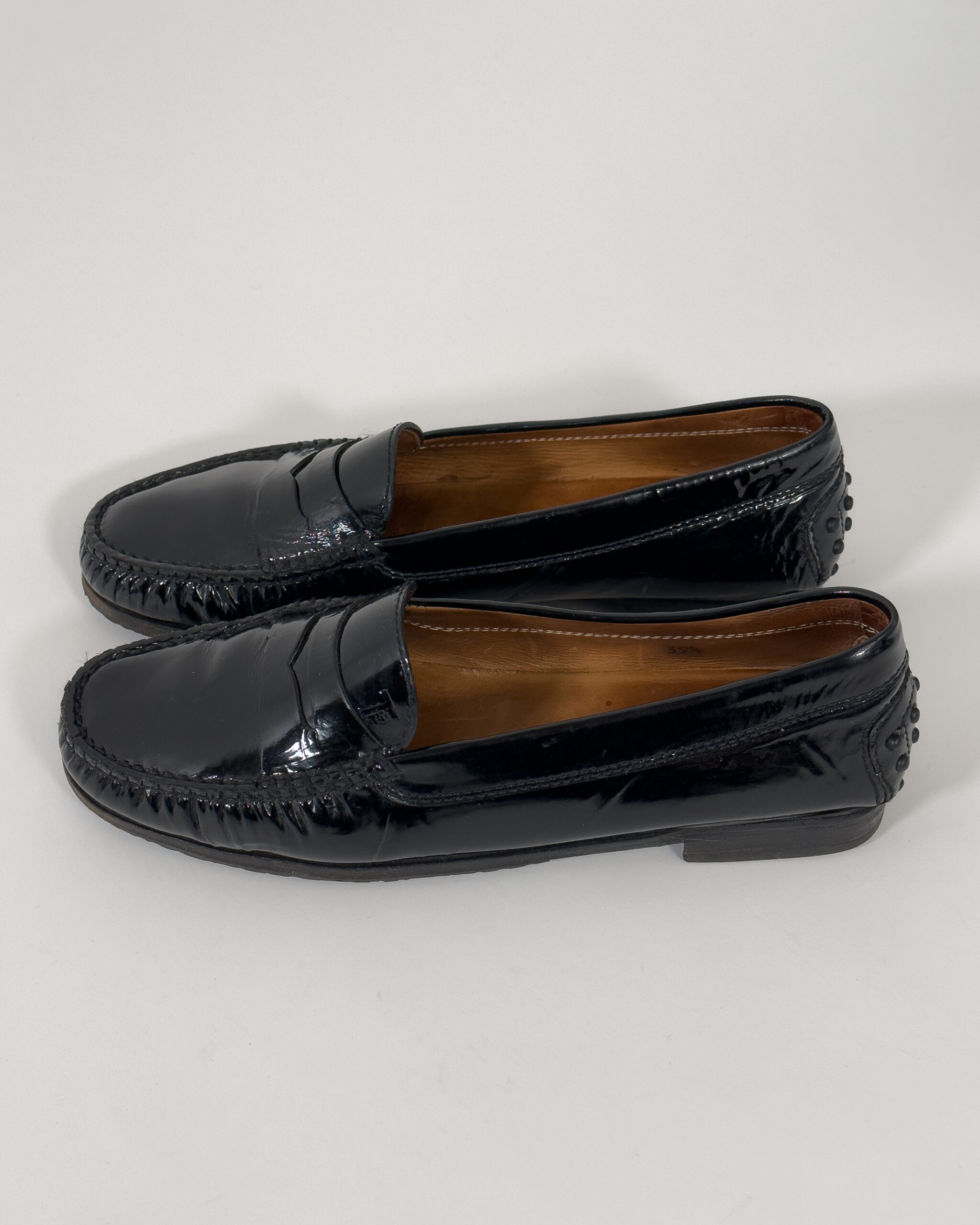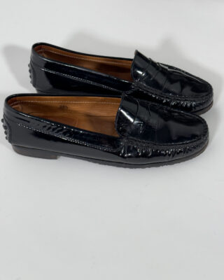 Classic Tods patent leather loafers. Handmade in Italy, featuring a sleek glossy finish, perfect for both casual and formal wear.